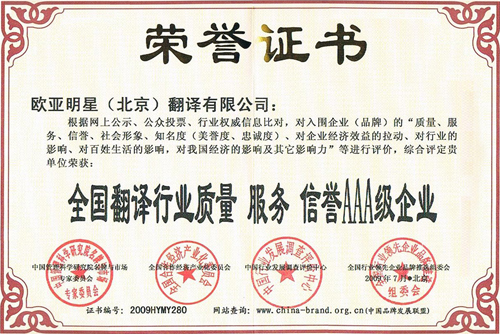 全国翻译行业质量 服务 信誉AAA级企业
